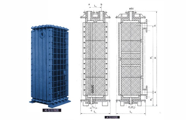 矩型塊孔式石墨熱交換器由截面為矩形的單元換熱塊疊裝而成,整體強度高,耐熱沖擊性能好,傳熱效率高使用壽命長,本公司常規(guī)生產(chǎn)均為內(nèi)聯(lián)式單向耐 腐蝕JK型與KS型兩系列,JK型側(cè)板為小塊,規(guī)格變化容易維修方便,KS型側(cè)板為 整體,增加上、下兩排緊固鏍柱.載熱體 分布更均勻。相同換熱面積時矩形塊孔式 設(shè)備高度比圓塊式小。本公司可根據(jù)用戶 要求生產(chǎn)外聯(lián)式、臥式安裝,雙向耐腐蝕 等具有其它特性之矩形塊孔式石墨熱交 換器。照片KS型實物圖,圖示為JK結(jié)構(gòu)圖。